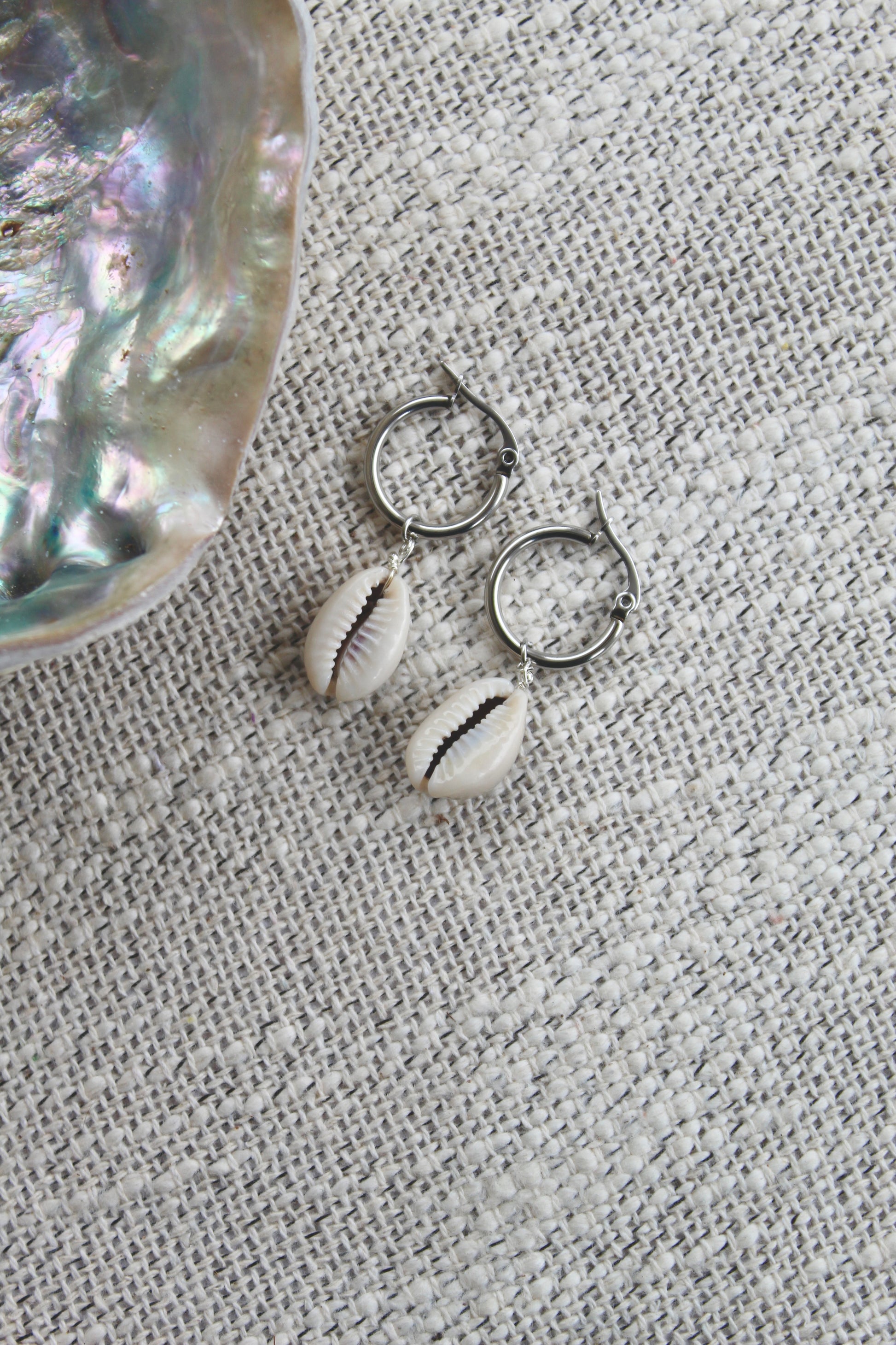 Each earring showcases a genuine cowrie shell gracefully suspended on a sleek stainless steel hoop. The cowrie shell, steeped in historical symbolism and exotic charm, brings a touch of coastal whimsy and bohemian flair to these earrings.