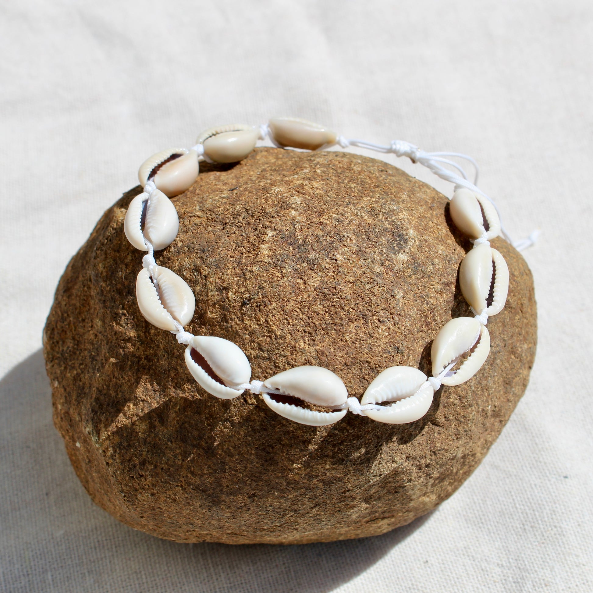 Each piece is handcrafted with care, and features genuine cowrie shells that are expertly selected for their shape, size, and natural beauty. The shells are then strung onto a durable yet delicate white cord, allowing for a comfortable fit that is adjustable to suit your individual style.