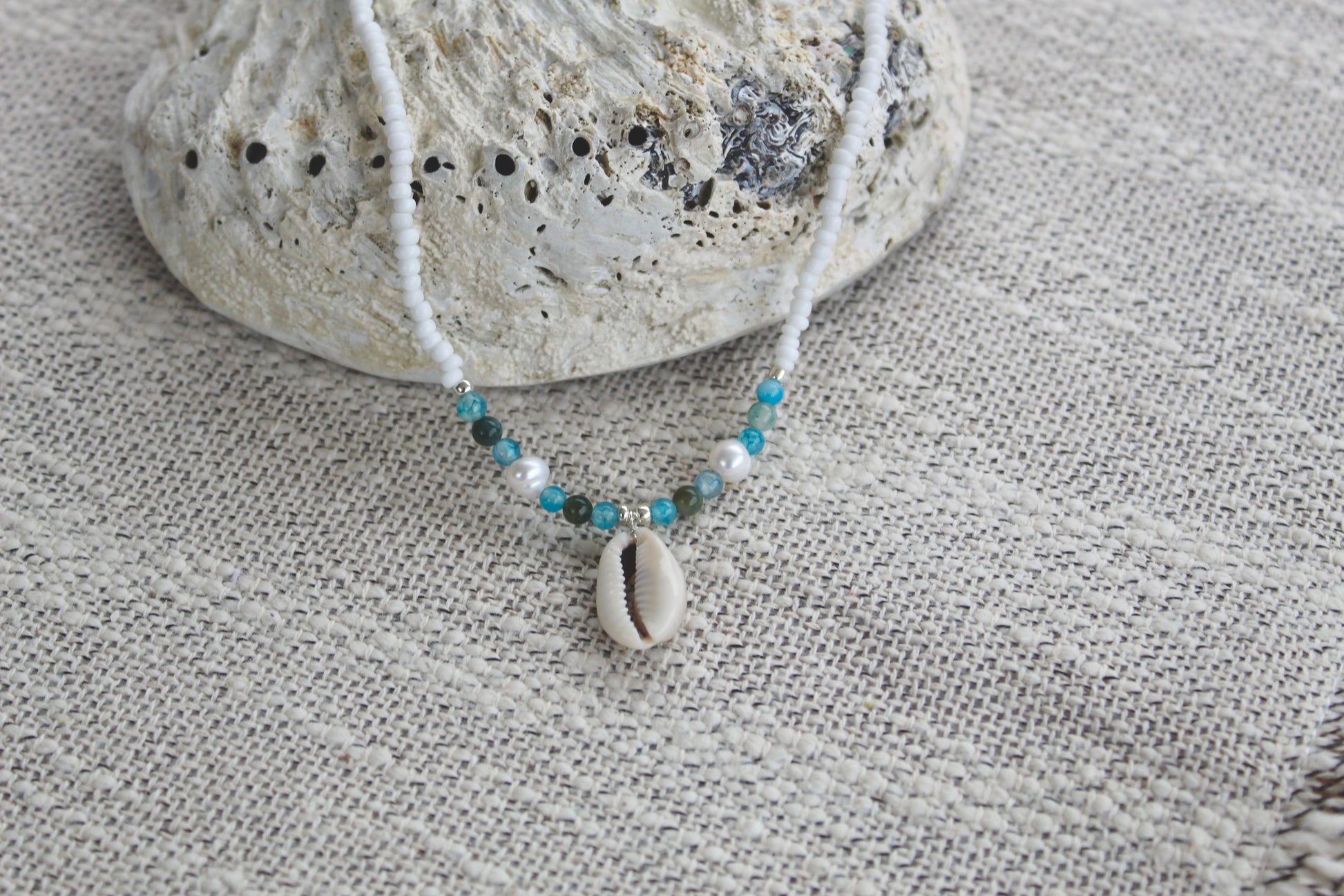 Embark on a journey to the ocean's edge with our exquisite Ocean-Inspired Necklaces, featuring captivating designs that echo the beauty of the sea. Choose from our beaded necklace adorned with a cowrie shell, gemstone beads in tranquil blues and greens, and lustrous pearls, or opt for a simple chain necklace showcasing a cowrie shell and a charming pearl accent.