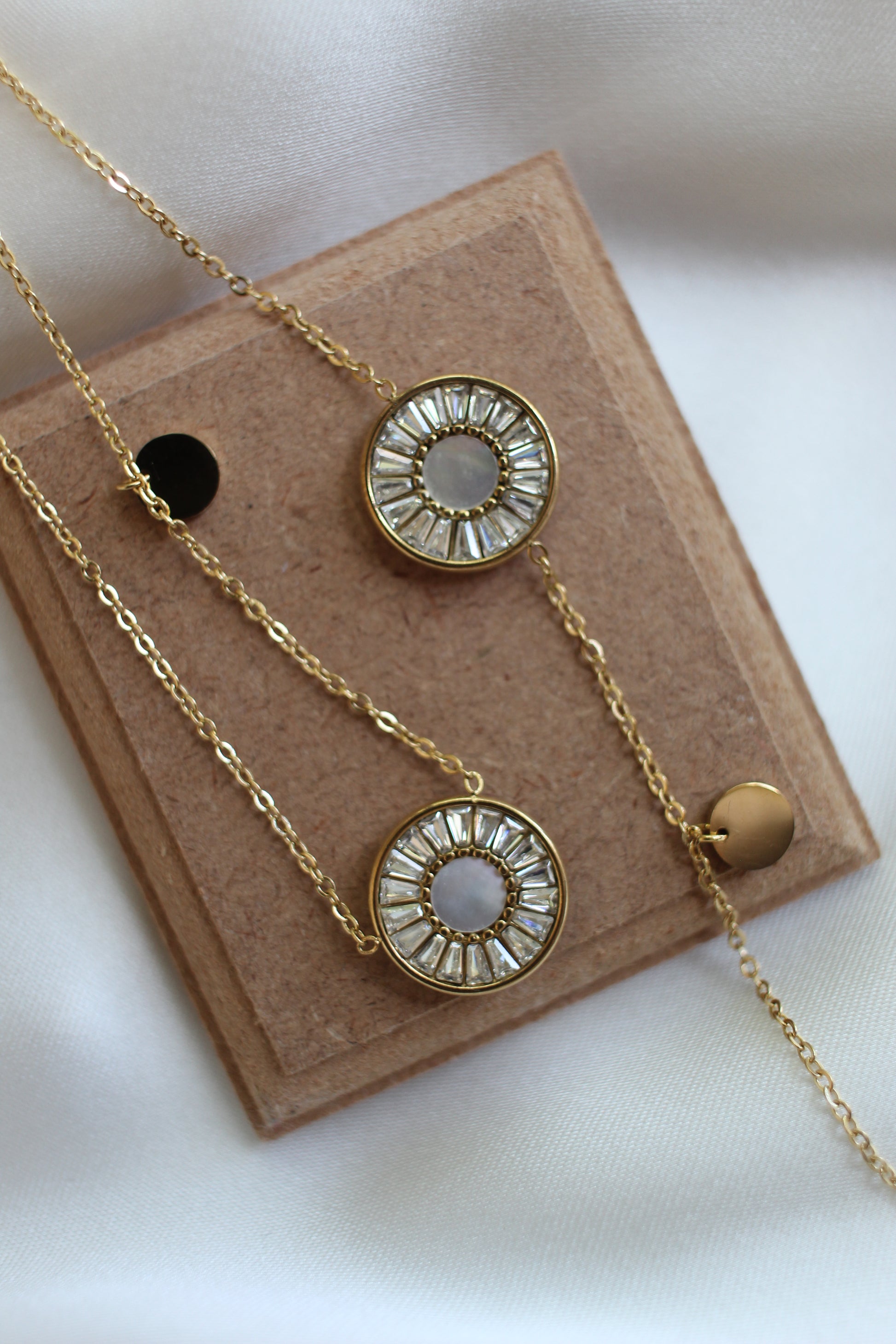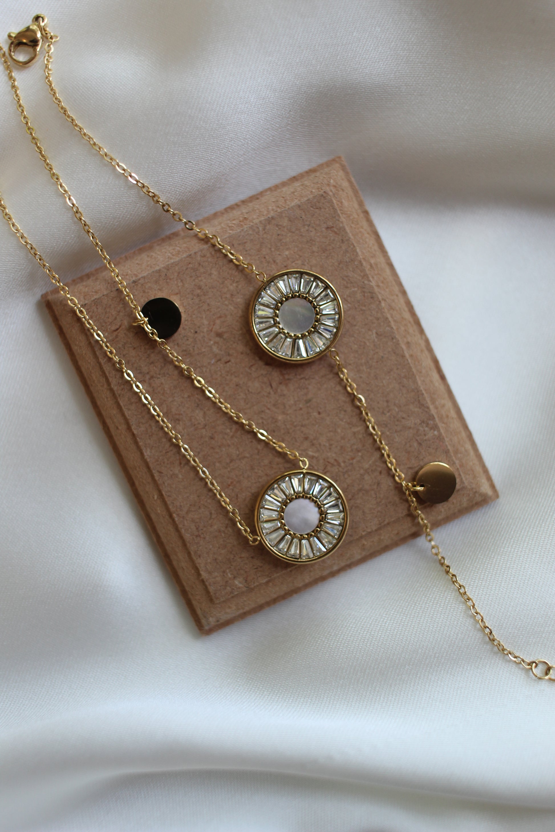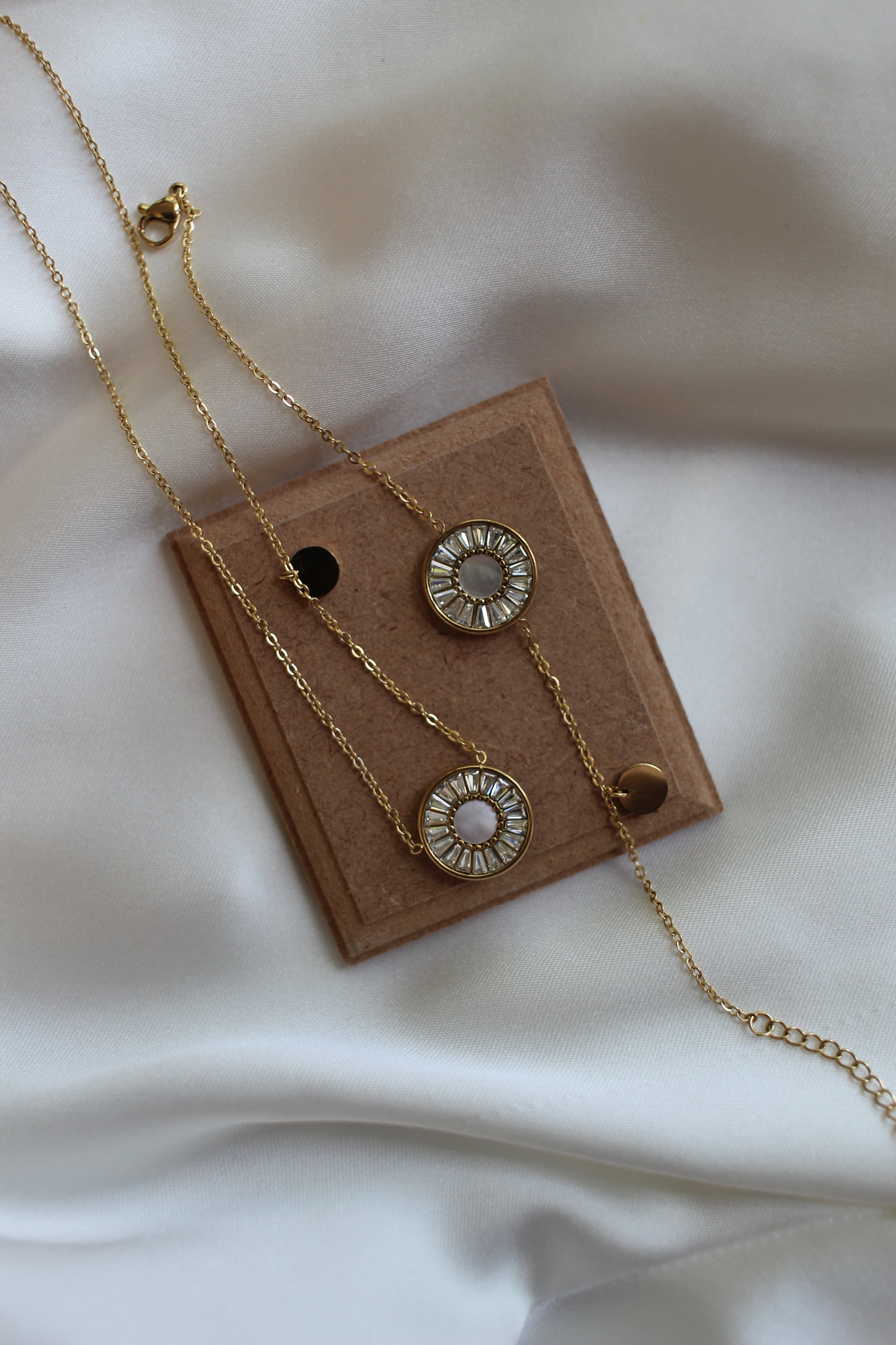 A matching necklace and bracelet set featuring round shell charms and sparkling cubic zirconia accents. Designed with a sleek circular charm motif, this minimalist set is crafted for everyday elegance and effortless style.