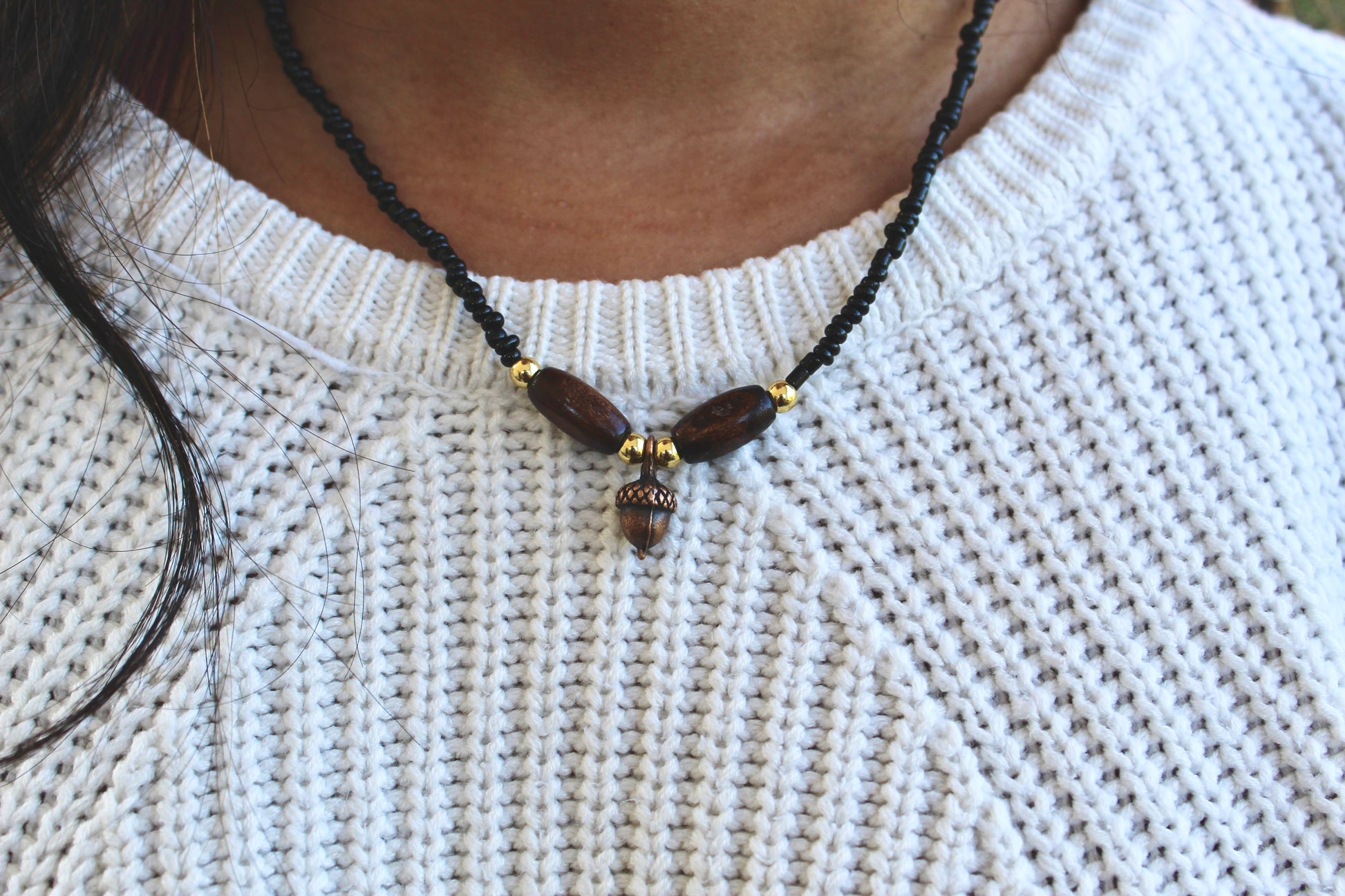 2. **Beaded Wooden Accents with Tiny Acorn Pendant Necklace**: